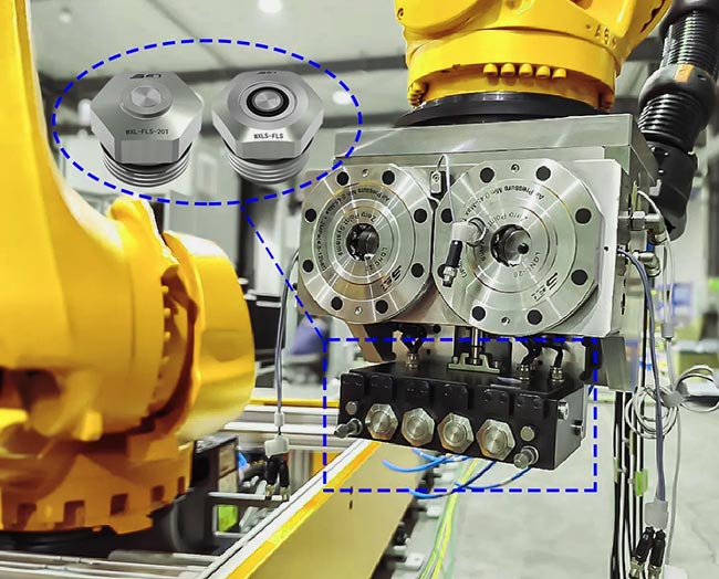 Efecto combinado: todo el proceso de sustitución está automatizado. Los robots o actuadores solo necesitan "abrochar" el módulo de herramientas en el localizador de punto cero, lo que completa automáticamente un posicionamiento preciso y un bloqueo fuerte. Al mismo tiempo, los conectores a prueba de fugas en ambos lados también completan el acoplamiento de manera automática y confiable, proporcionando instantáneamente energía (fluido) y señales de control para la herramienta. Al desconectar se invierte la secuencia, primero desconectar el conector (cerrado sin fugas), y luego desbloquear el localizador.